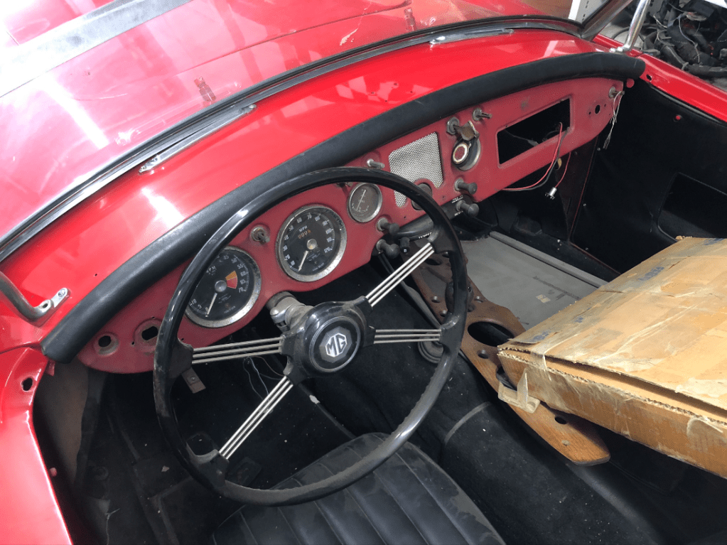 The MGA was clearly a restoration project that someone had poured money into for stuff like a good paint job, new chrome, leather interior, brakes etc. On the other hand, it had clearly sat in the back of the shop for a long time and thinks like the hoses, brake cylinders, master cylinder, clutch slave etc. would have to be replaced as the rubber was likely no good from time and lack of use. The engine compartment was a mess with a half-hearted attempt to install a new wiring harness. The body exterior and door interiors had been pained – but not the engine compartment. The car appeared to originally have been black and was now red. The faded red on on the dash suggested it had a red interior originally. Black paint with a red interior was a common factory combination for the MGA.