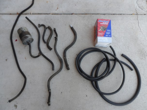 Now the injector rail hoses fit extremely tightly. Cutting them with a blade is an invitation to nick the rail metal and ruin the seal between the rail and hose. Instead, use the tip of a hot soldering iron to melt the rubber on the hoses and remove them. It works fine. Below are the parts you need to replace the lines. You need four injector lines of course. You can use the hose clamps, or simply place the little caps on each end of the injector hose. The metal caps keep the hose from expanding and that is all the factory used. You also need some additional fuel hose aside from the small lengths for the injectors. Be safe and do as you see fit – remember that an engine fire is possible if you have leaks.