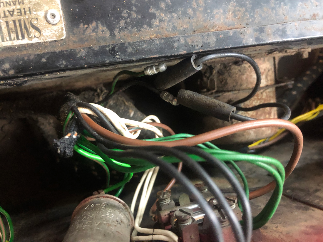Beneath the dash there are two ports and cardboard hoses that direct air to the windscreen. These obviously have to be removed. However, I have also found that the aluminum outlet ports have to be removed from the heater box to get the unit free of the heater shelf. Once these are removed you can lift the heater free of the car. Be careful – it is relatively heavy and you do not want to dent the top of a fender getting it away from the car.