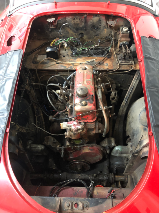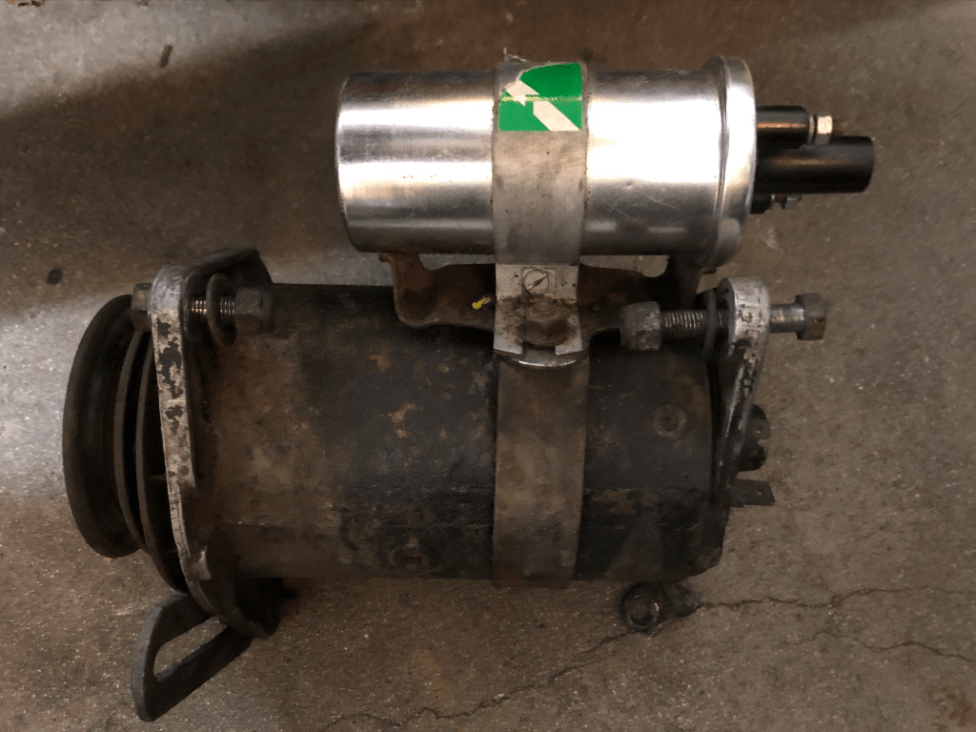 The fan belt drives the water pump of course – so that had to be removed and will be replaced. The tension for it is provided by the generator. I knew I was going to want to clean the generator and replace the brushes, so I would be completely removing the generator. In this model of MGA the coil is held on top of the generator by a bracket. So, the coil comes off at the same time as the generator.