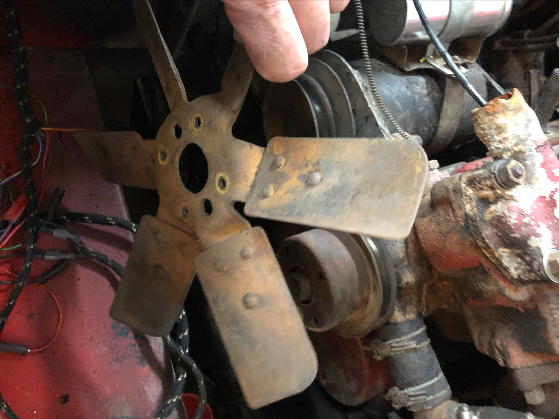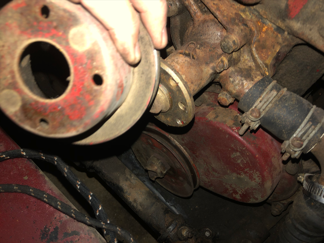 The car still had its original metal fan. It was still the original yellow. Unfortunately these fans can develop cracks and send blades flying into the bonnet or other areas in the engine compartment. The metal fan will be replaced with a safer and more efficient plastic one. Once the fan is off it is easy to remove the water pump pulley-cover and then the water pump itself.