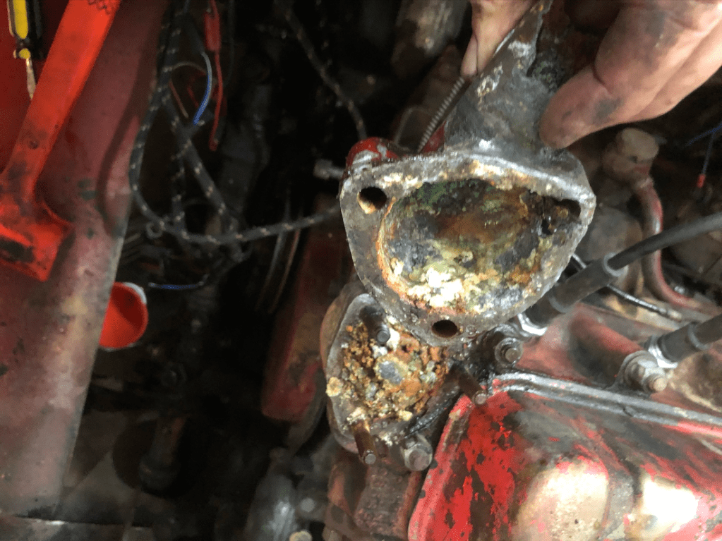 I also knew the thermostat cover was rotten and that I would be replacing the thermostat – so out these would come. Wow, was the cover ever rotten inside.