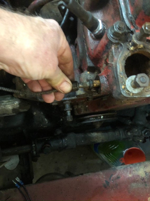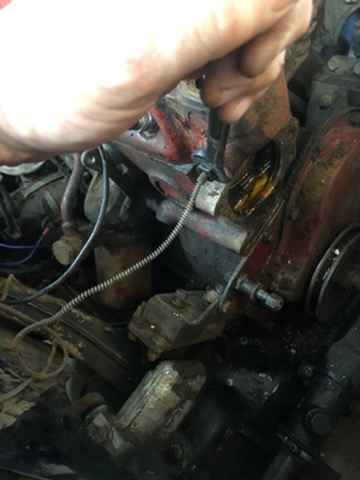 You remove the temperature sensing bulb by unscrewing it from the head. Be careful that the fitting that you are unscrewing has not become stuck to the capillary line by crud. If it has and you start twisting, you will break the line and will need either a costly repair or a new gauge. There were various ways that MG ran the capillary line from the front of the engine to the bulkhead and then to the gauge. Many are run along the engine, attached to the bottom of the heater valve at the back of the engine, up to p clamp on the heater shelf and then through a rubber grommet on the bulkhead. You will notice corkscrew twists in the line between the engine and when it attaches to the body. This is to allow the line to flex and accommodate movement of the engine relative to the body. In the case of my car the line ran to the inner fender, was held by a p clamp there, and then ran back along the inner fender to the bulkhead. WHen you remove the instrument you can either push the rubber grommet on the bulkhead back into the interior of the car, or cut it away if it is too stiff. Careful not to nick the capillary tube.
