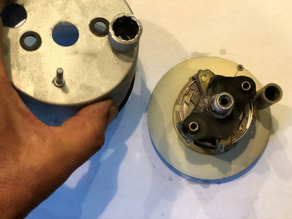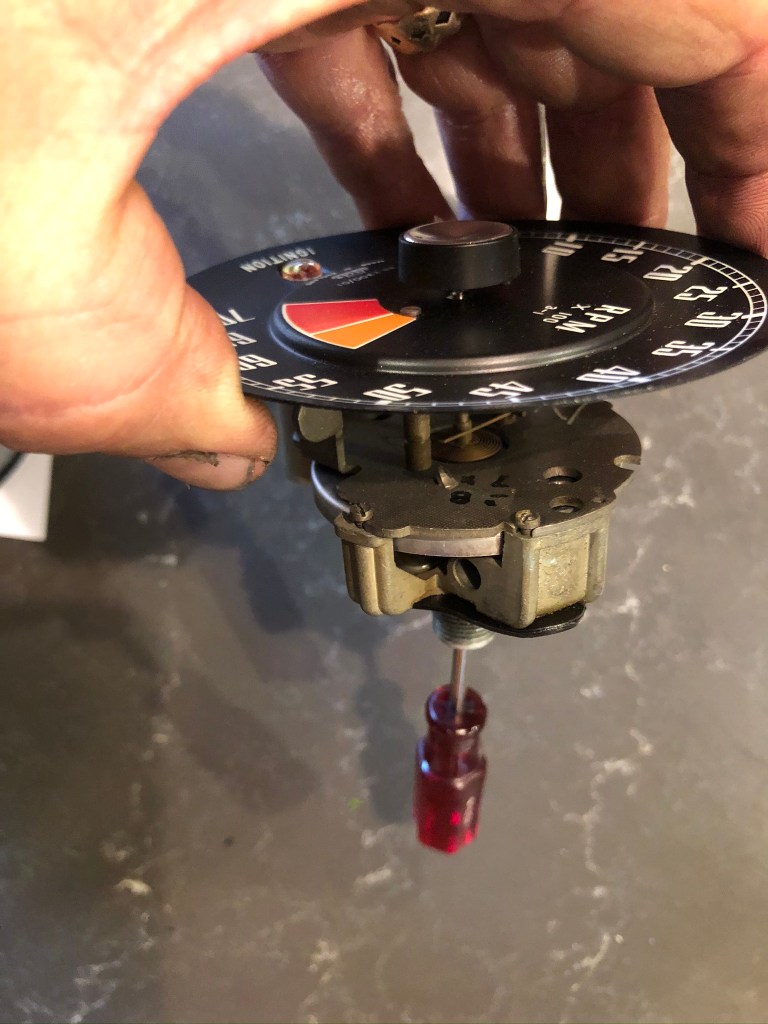 Removing the instrument’s mechanism from the tachometer is done from the back. Sometimes the mechanical works are simply jammed with dirt and gunk and a careful cleaning will set things right. A small screwdriver can turn the mechanism once it is free again.