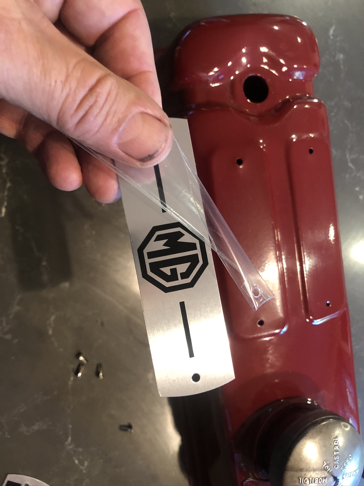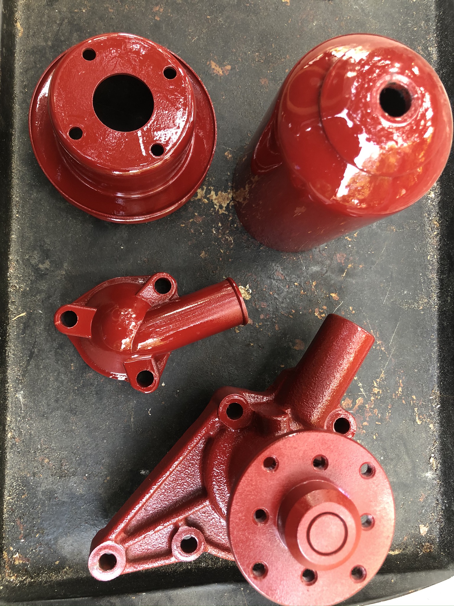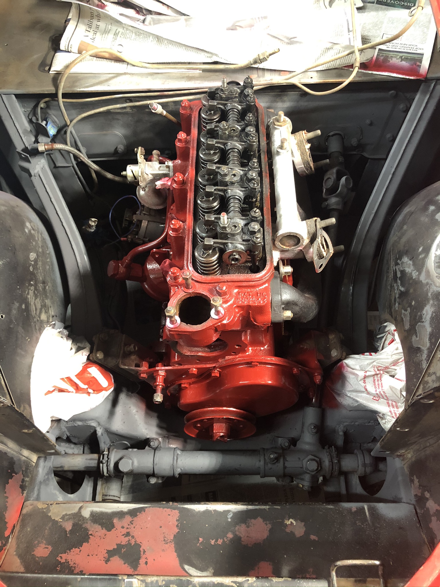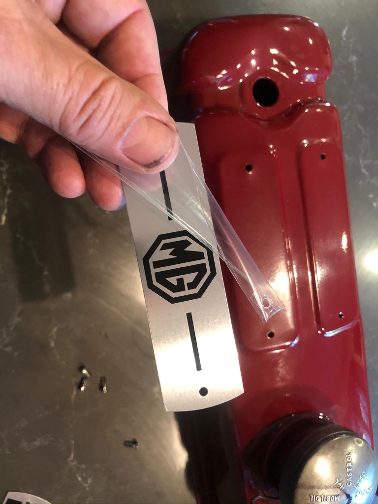 After I stripped the various engine parts, I used a red heat capable primer, fine sanded things like the valve cover, and then top-coated with the Moss Motors T-Series red engine paint. I also added the metal identification and patents plates to the valve cover using small rivets. Smaller parts , such as the valve cover and oil filter canister were also baked after being top-coated. On the block and head I painted over the head studs and nuts as that was the way the engines were painted originally. Later, when I put the car on the light and was able to clean, strip and paint the oil pan. I think things turned out very well indeed! See the process and results below –