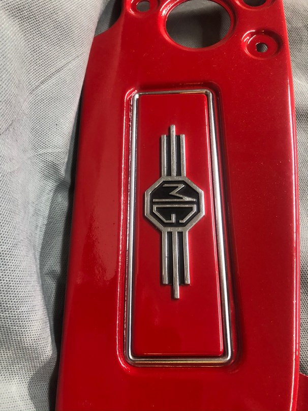 I love the MGA dash just the way most of them came out of the factory – shiny painted surface with bright chrome, crisp instruments and the little MG symbol filling the radio hole. By the way – although many of these radio hole cover plates are painted flat black, they should actually be the same finish as the rest of the dash (see below).