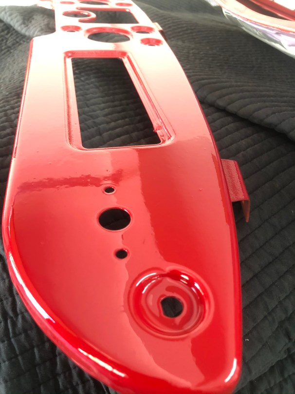 After all the switches and instruments were removed, I stripped the paint off the dash, repaired any dents etc and then applied a reddish sandable primer. After that I shot the back with an industrial flattish black and the face with the same PPG single stage red as I used on the rest of the car. After the painting was done and at a good high gloss to match the body, I reinstalled the cleaned instruments – except for the oil pressure/water temp gauge which is left until the dash is back in the car due to the fragile nature of the water temperature capillary tube . There were new chrome bezels all around of course!