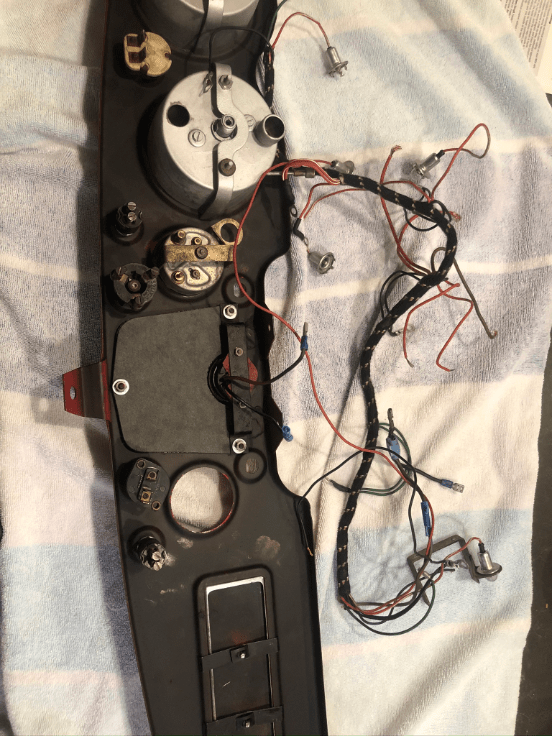 When the dash has all the switches and instruments installed, and is on the bench rather than in the car, it is easy to install the short section of new wiring harness that links all the electrical components and lights together. That short section of harness will eventually be joined to the main wiring harness.