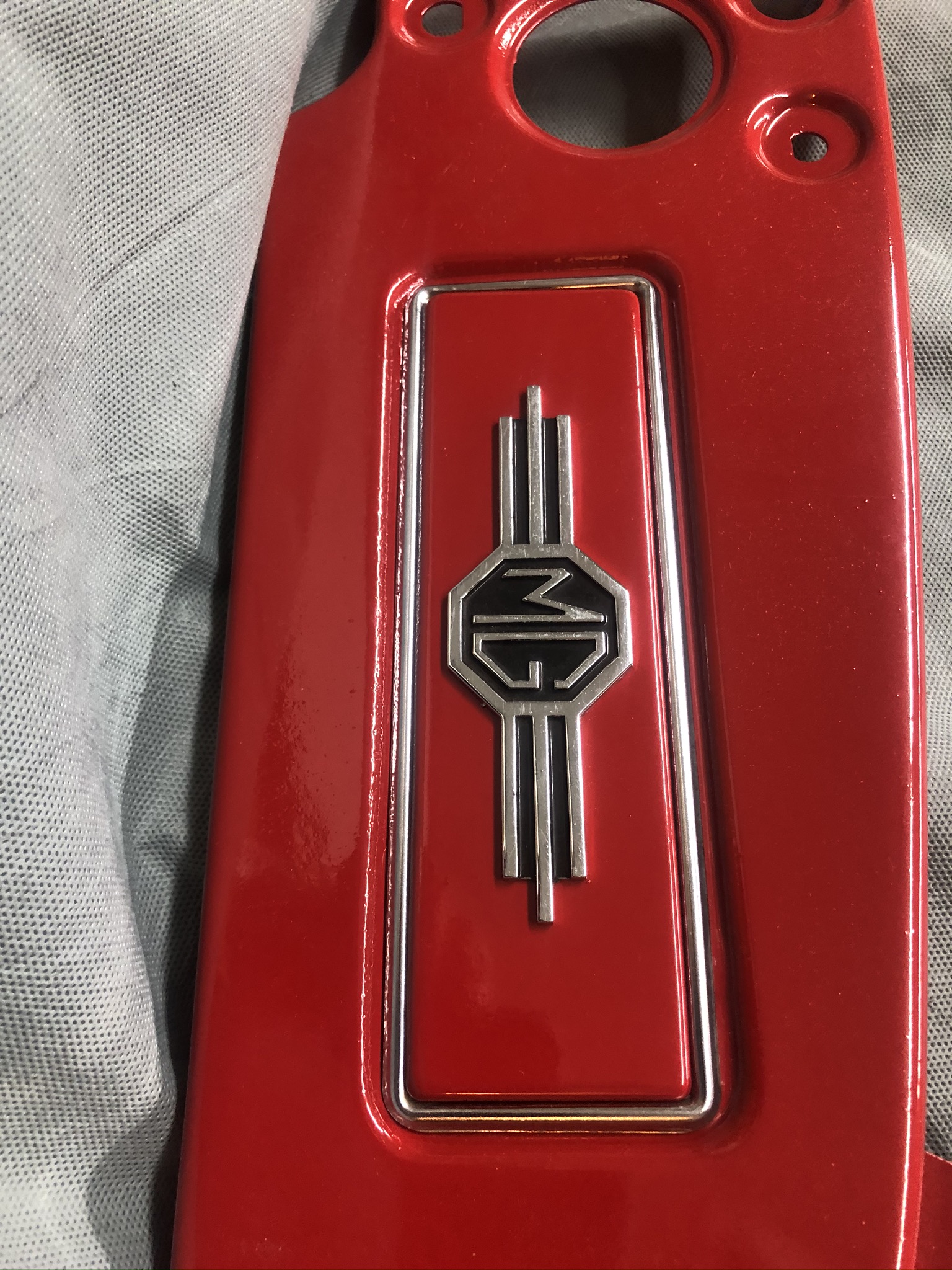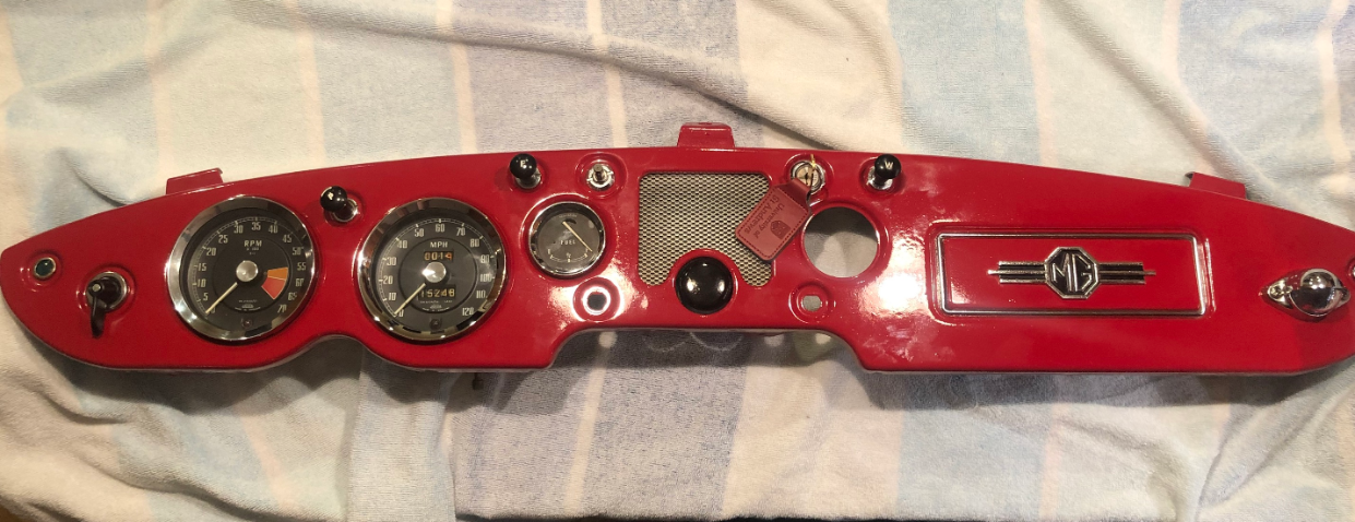 I love the MGA dash just the way most of them came out of the factory – shiny painted surface with bright chrome, crisp instruments and the little MG symbol filling the radio hole. By the way – although many of these radio hole cover plates are painted flat black, they should actually be the same finish as the rest of the dash (see below).